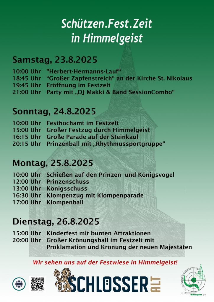 Schützenfest 2025 in Himmelgeist 19. Juli 2025/in Allgemein /von Christian Möller Das Schützenfest in Himmelgeist findet vom 23. August bis 26. August 2025 auf der Festwiese im Himmelgeist statt. Wir freuen uns auf euren Besuch! http://schuetzen-himmelgeist.de/wp-content/uploads/2020/08/willkommen.png 0 0 Christian Möller http://schuetzen-himmelgeist.de/wp-content/uploads/2020/08/willkommen.png Christian Möller2025-07-19 17:21:252025-07-19 17:21:54Schützenfest 2025 in Himmelgeist