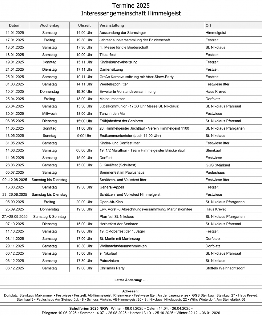 wir haben die regelmäßigen Veranstaltungen in Himmelgeist im Jahr 2025 terminiert.